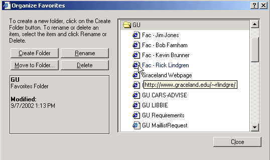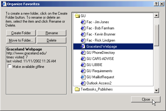 The following screenshots are for Graceland students, faculty, or staff, who want to fix broken bookmarked links to Graceland webpages following the switchover to the new Graceland University webspace on November 11, 2002. The screenshots show Internet Explorer (v5.5) on Windows 2000. However, the principles are the same even if your situation differs. For instance, if you are using Netscape as your browser you may find a menu option of Edit Bookmarks rather than Organize Favorites.
