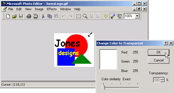 These instructions are a supplement to Step 1 of the earlier instructions that showed you how to create a GIF image with a Transparent background color using the Microsoft Paint program. Unfortunately, the version of Paint on Windows 2000 lets you identify a transparent color but the Windows XP version does not. These instructions show you how to take your GIF creation (created and saved by Paint) and to reopen it with Microsoft Photo Editor to set a transparent background color. All of the lab PCs on campus should have Microsoft Photo Editor on them (it is one of the Microsoft Office Tools).